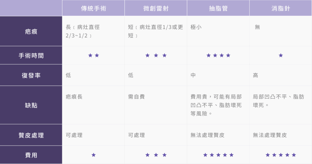 - 缺點:疤痕較長且明顯,如脂肪瘤過大切除後會有多餘的贅皮。