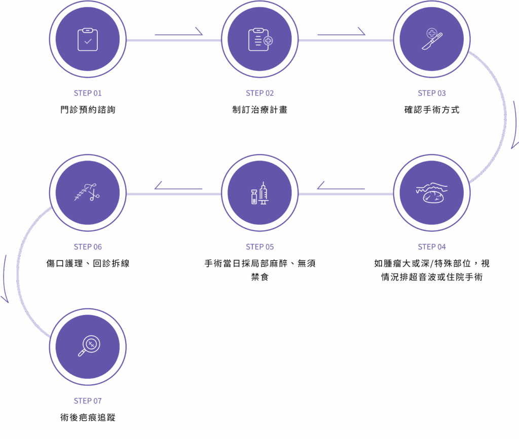 - 方式:利用比傳統手術更小的創口進行手術,將整塊脂肪瘤取出。