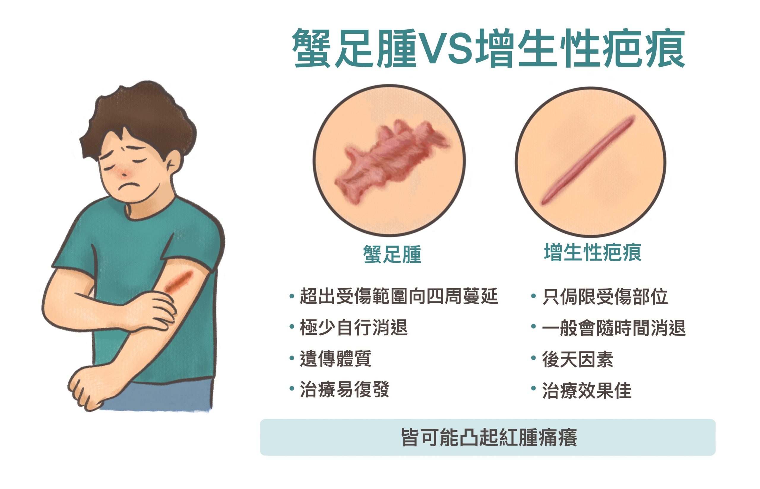 相較於蟹足腫,增生性疤痕(Hypertrophic scar)會沿著先前受傷的範圍作增生,並不會像是蟹足腫一般侵蝕正常的皮膚,可以把它視為蟹足腫的弱化版,但治療上原則相同。