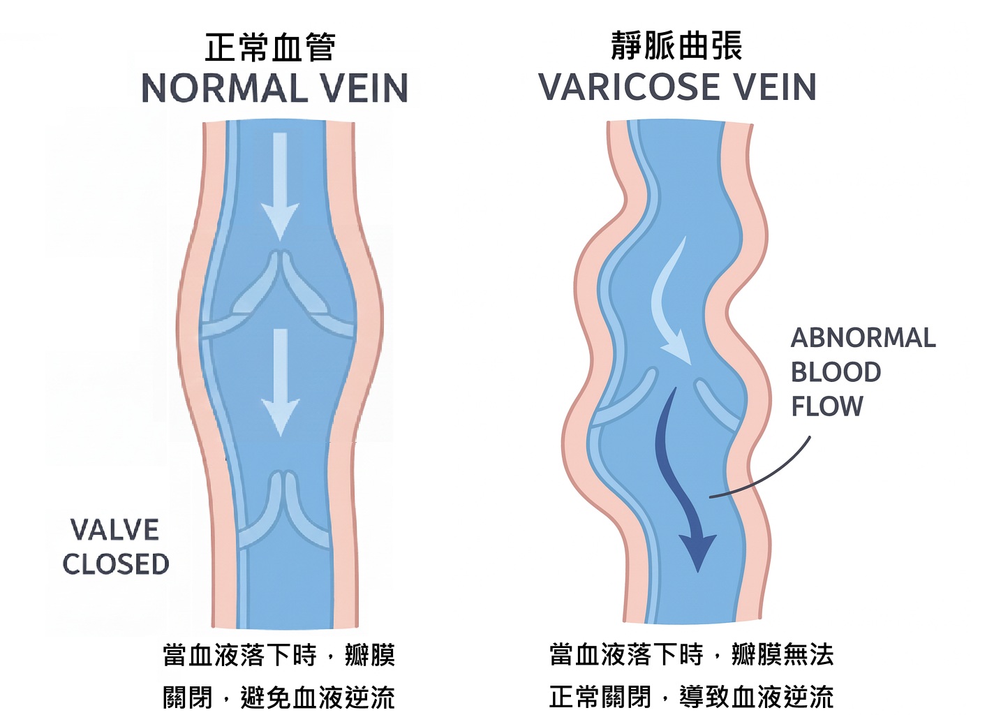 當這些瓣膜受損、靜脈失去彈性而變寬鬆、或因為各種原因導致的靜脈壓升高時,瓣膜阻止血液逆流的功能就會失效,導致血液在靜脈中積聚。這些積血會間接造成下肢靜脈腫脹、拉伸和扭曲,最終形成蚯蚓狀的血管就是我們所說的靜脈曲張。靜脈曲張雖然可以出現在身體的任何部位,但最常見於腿部和腳部。